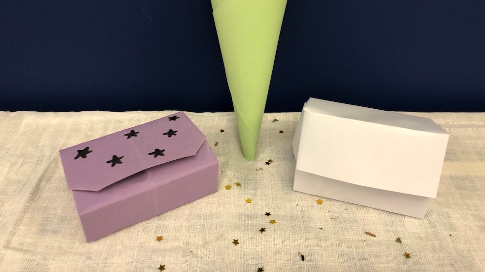 - Die entstandenen Laschen innen festkleben, sodass ein Kasten entsteht.