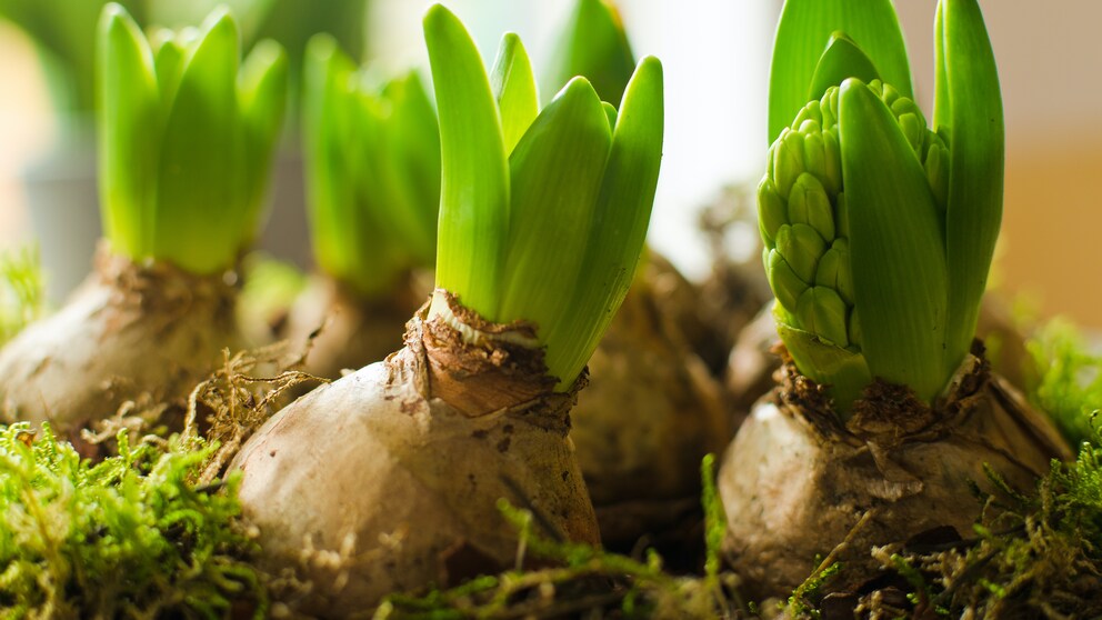 Die Hyazinthen sollte zunächst kühl, bei etwa fünf bis neun Grad, an einem eher dunklen Ort abgestellt werden. Zum Beispiel im Keller. Und zwar so lange, bis kräftige Wurzeln gewachsen sind. Dann darf man die Gläser ins Hellere holen – aber auch hier noch nicht zu warm stellen. Man sollte die Pflanze langsam, nach und nach an Wärme und Licht gewöhnen.