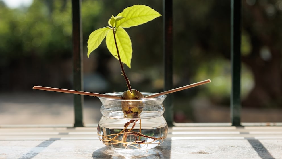 Der ideale Standort ist warm, hell und vor Zugluft geschützt. Regelmäßiges Wasserwechseln ist Pflicht. Nun ist Warten angesagt. Mit ein wenig Glück zeigen sich nach etwa drei bis zehn Wochen Wurzeln und Trieb. Wenn die Avocadopflanze die ersten Blätter ausgebildet hat, ist es ratsam, sie in einen etwa 20 bis 30 Zentimeter breiten Topf zu pflanzen. Dabei sollte der Kern maximal zur Hälfte in der Erde stecken. Die Zahnstocher werden vorher entfernt.