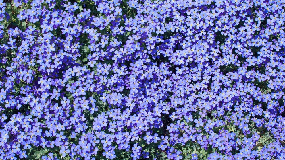 Eine weit verbreitete Gattung sind die Blaukissen. „Der Name ist Programm zur Blütezeit“, erklärt Hofmann. Er beschreibt die Pflanze als kompaktes Polster, dessen Blätter im Frühling je nach Sorte vollständig von weißen, blauen oder violetten Blüten bedeckt sind.